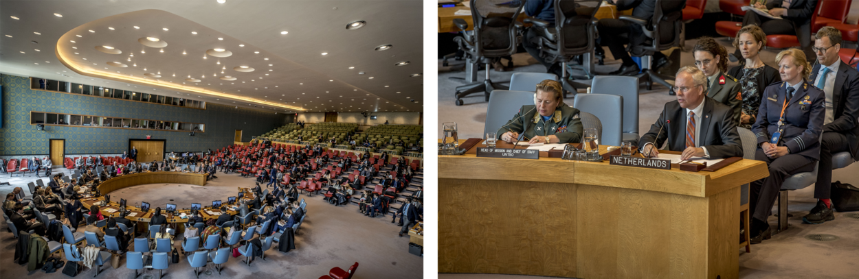 Een van de dingen die de korporaal de afgelopen weken het meest is bijgebleven is een debat in de VN-Veiligheidsraad, waarbij ze letterlijk achter ambassadeur Karel van Oosterom aan de hoefijzervormige vergadertafel zat. “Het ging over de positie van vrouwen in uniform bij de VN. Hoe hoger in de organisatie, hoe minder vrouwen er vertegenwoordigd zijn. Het aandeel dames is überhaupt niet erg groot.”