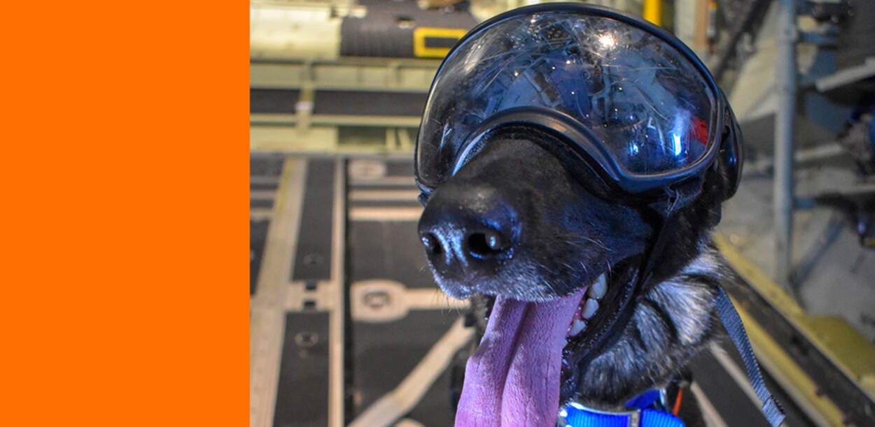 ‘Callie’ is opgeleid als reddingshond bij de Amerikaanse luchtmacht en staat, voorzien van haar eigen veiligheidsbril, op het punt om boven Alaska uit een HC-140 Hercules te springen