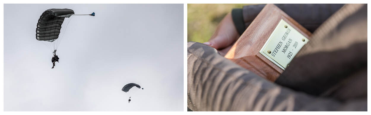 Aan pathfinder kapitein Bjorn Coppers van 11 Luchtmobiele Brigade de eervolle taak om met Morgans urn de sprong te maken. En dat op een wel heel bijzondere locatie: dropzone X-Ray. Exáct de plek waar de geallieerde parachutisten, onder wie Morgan, in 1944 tijdens operatie Market Garden hun poging startten om het Duitse verzet te breken. “Ik wilde hier altijd al een keer springen. Deze plek leeft, zelfs na al die jaren. Het verhaal van Steve versterkt die beleving absoluut”, benadrukt kapitein Coppers.
