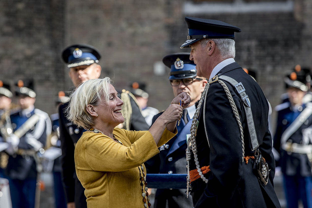 “Hierbij aanvaard ik het commando van de Koninklijke Marechaussee.” Met deze woorden nam luitenant-generaal Hans Leijtens op een zonovergoten Binnenhof het commando over de marechaussee op zich. De scheidende commandant, Harry van den Brink kreeg van minister Bijleveld een Koninklijke Onderscheiding. Foto: sergeant-majoor Maartje Roos.