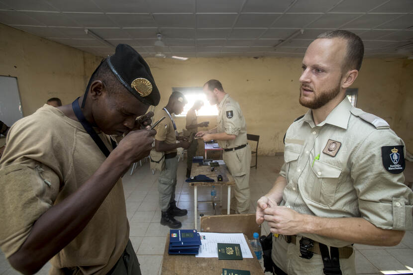 “Wie kan de relevante wet- en regelgeving opnoemen in volgorde van belangrijkheid?”, vraagt opperwachtmeester Rudi in het Frans aan de klas. Meerdere vingers vliegen de lucht in. De cursist die de beurt krijgt, staat op en somt het aangeleerde rijtje vlekkeloos op. De Nigerese politieagenten krijgen naast wet- en regelgeving ook les in onder meer paspoortcontrole en migratiestromen.
