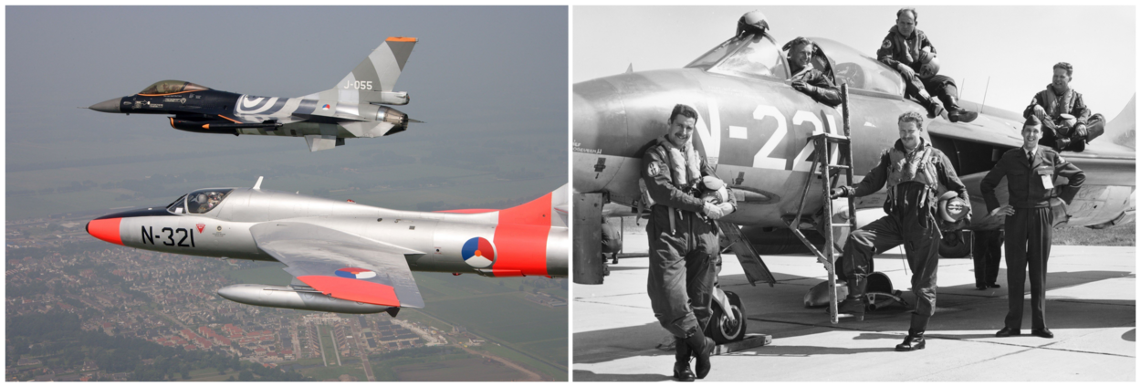 We beginnen een paar jaar na de Tweede Wereldoorlog. De Koude Oorlog is begonnen en Nederland moet zich als lid van de NAVO herbewapenen. De 2-motorige Britse Gloster Meteor arriveert in 1949, het eerste straalvliegtuig dat op Leeuwarden wordt gestationeerd. Een echt 1e generatie overgangsvliegtuig; de propeller is ingeruild voor straalmotoren. Eigenlijk is er niet meer veranderd: geen radar, geen schietstoel (althans niet in de eerste versie), maar toch is iedereen euforisch over de 'glanzend witte vogels' die met ruim 900 km/u het luchtruim doorklieven. We krijgen in totaal 266 Meteors in diverse uitvoeringen, waarvan er maar liefst 74 verloren gaan. De techniek is in die dagen nog niet je van het en de vereiste snellere handelingsvaardigheid en de hoge landingssnelheid blijken wennen voor de vliegers destijds...