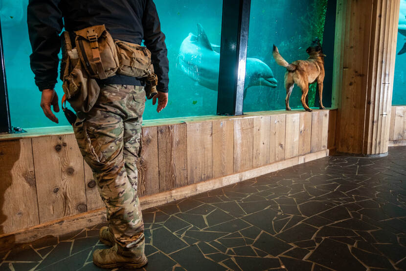 Om zowel hond als geleider ervaring op te laten doen in het speuren op niet alledaagse plekken, is de hondensectie van Vliegbasis Gilze-Rijen altijd op zoek naar uitdagingen. In Harderwijk kunnen beiden volgens oefenleider sergeant-majoor Jan-Willem Jonk hun hart ophalen. Explosievenspeurhonden van Defensie moeten overal ter wereld inzetbaar zijn. Van een stinkende machinefabriek in een ver crisisgebied tot de kletsnatte verblijven van zeekoeien in het Dolfinarium. “We schotelen ze verrassingen voor waar ze zich allebei overheen moeten zetten”, aldus Jonk.