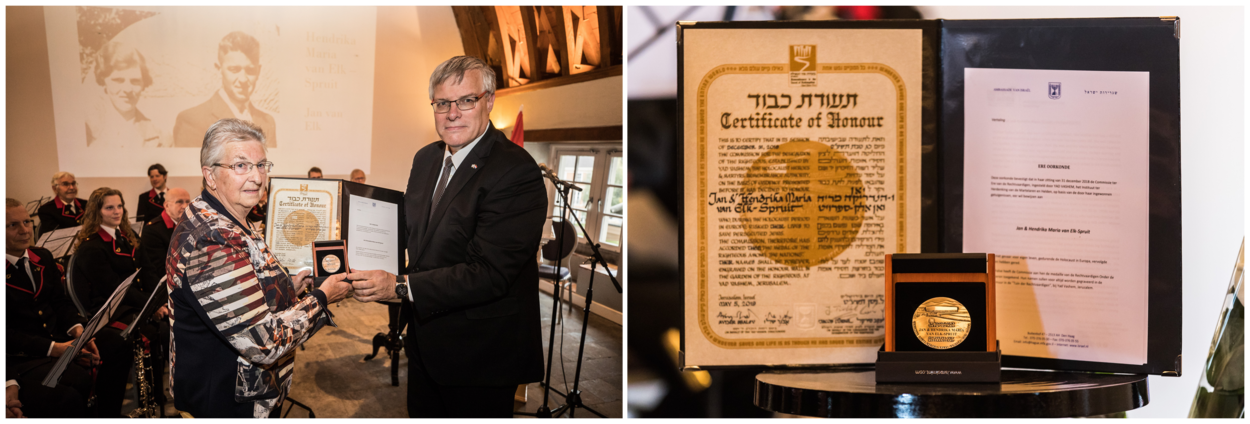 De ultieme erkenning ontving het echtpaar Van Elk op 1 november op het Kasteel van Woerden. Tijdens een indrukwekkende met muziek omlijste plechtigheid reikte de Israëlisch ambassadeur Naor Gillon postuum de Yad Vashem-onderscheiding uit aan Jan én Marie. De hoge onderscheiding wordt toegekend aan mensen die Joden hebben gered, onder meer tijdens de Holocaust.