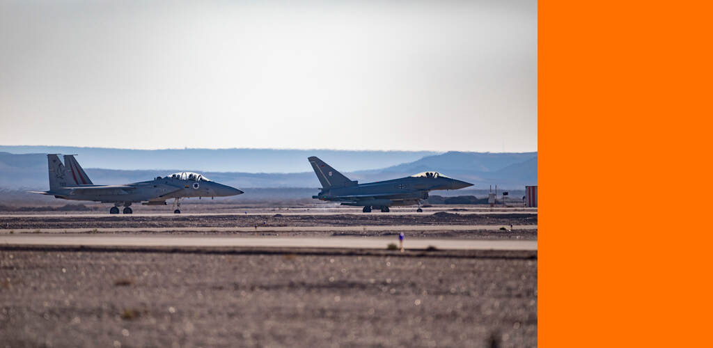 Een bijzondere foto: een Israëlische F-15 Eagle en Duitse Eurofighter samen op de startbaan van de Israëlische vliegbasis Uvda. De toestellen deden mee aan de grote luchtmachtoefening Blue Flag.