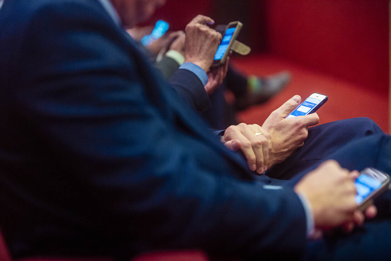 Het is niet zo dat de aanwezigen van een symposium in Stroe niet geïnteresseerd waren in de spreker, maar het was een interactief symposium waarbij met een smartphone meegedaan moest worden. Foto: Jarno Kraayvanger.