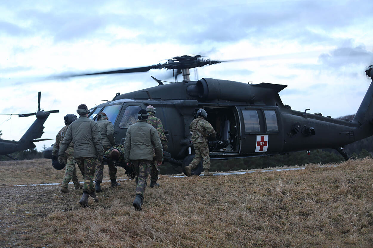 Militairen van 43 Gemechaniseerde Brigade brengen samen met Amerikaanse collega’s een oefengewonde naar een helikopter. De militairen uit Havelte trainen in Hohenfels, Duitsland. De oefening Combined Resolve XIII is erop gericht om vooral de Amerikanen te laten wennen aan Europese omstandigheden en samenwerking met de partners. Er doen meer dan 5.000 militairen aan mee. Foto: Spc Audrequez, JMRC Public Affairs.