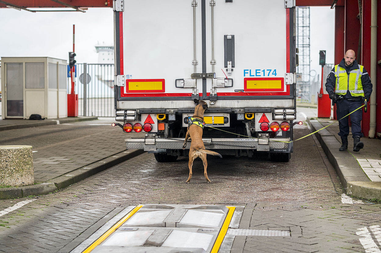 Dit is geen inklimmer, maar een hond die op zoek is naar inklimmers. Een werkplek van een viervoeter waar zijn (of haar) speurneus goed tot zijn recht komt. Foto: Valerie Kuypers.