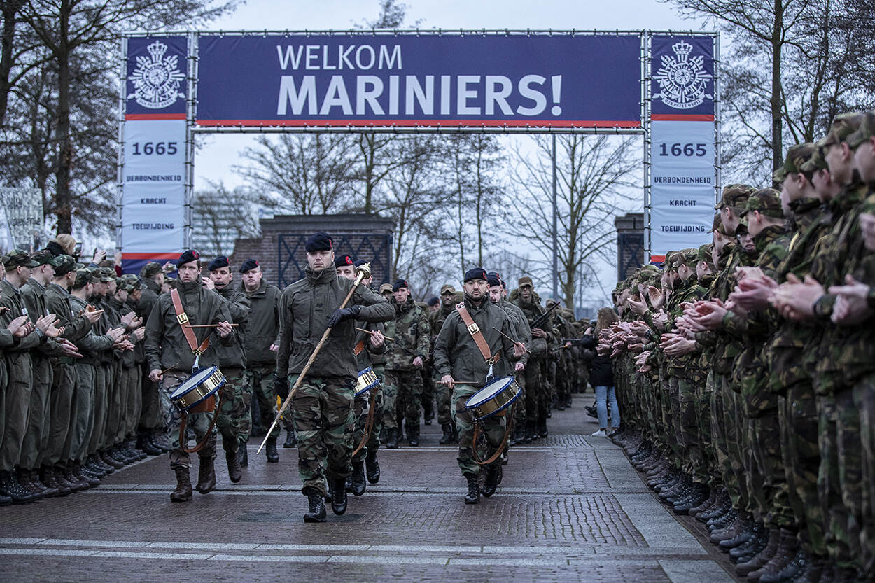 Een eindoefening vraagt vaak het uiterste van militairen-in-opleiding. Zeker wanneer het mariniers betreft. De binnenkomst en baretuitreiking maken veel goed. Foto Hille Hillinga.