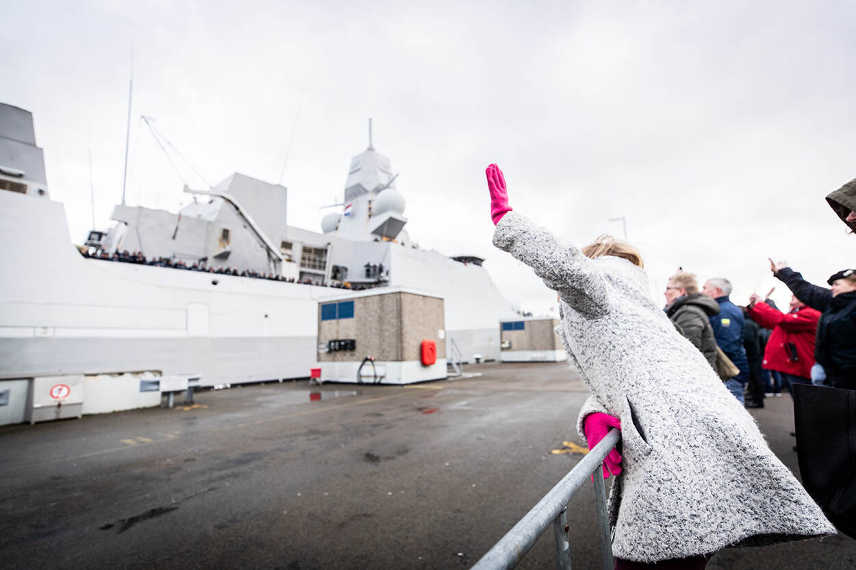 Afscheid van Den Helder of afscheid van het fregat De Ruyter. Het is maar waar je staat, op de kade of aan de railing. Feit is dat het fregat op weg is naar de Straat van Hormuz. Sergeant Jan Dijkstra maakte het afscheidsportret (vanaf de kade dus).