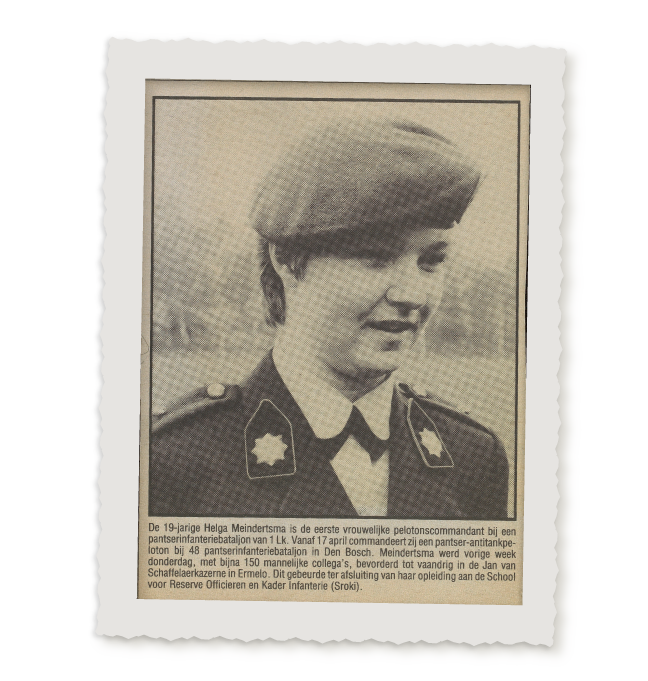 In oktober 1988 begint Helga Meindertsma aan een opleiding die nog niet eerder door een vrouw is voltooid: die tot officier bij de infanterie. Helga gaat samen met de dienstplichtige officieren in opleiding met een ‘kort contract voor vrouwen’ op de Jan van Schaffelaerkazerne in Ermelo.