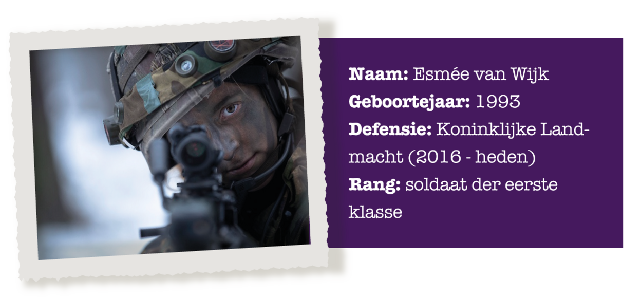 Ze verkocht haar paard, zette haar relatie op het spel en zegde een mooie baan als tandartsassistente op. Met een behoorlijk risico dat haar opleiding tot infanterist zou mislukken. Dat ze na 26 weken haar baret mocht ontvangen ziet Esmée als 1 van de hoogtepunten in haar prille loopbaan bij de landmacht. Eenzaam was het als enige meisje soms wel.