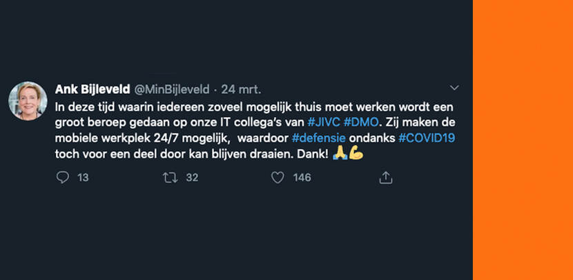 Minister Ank Bijleveld heeft via Twitter een compliment uitgedeeld aan het Joint Informatievoorziening Commando van Defensie. Deze organisatie heeft er in een mum van tijd voor gezorgd dat de defensiemedewerkers beschikken over de juiste IT-systemen om thuis door te kunnen werken.