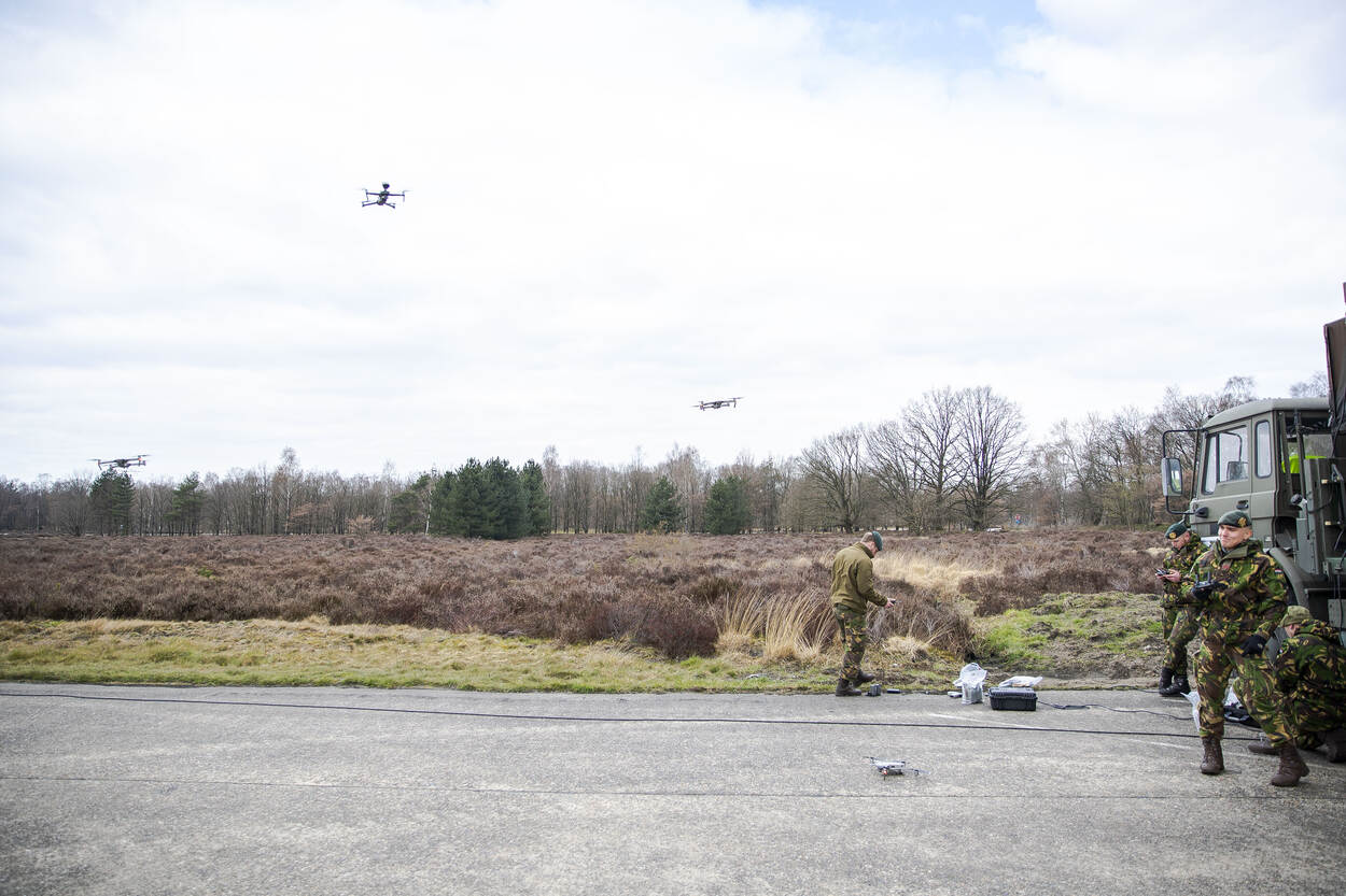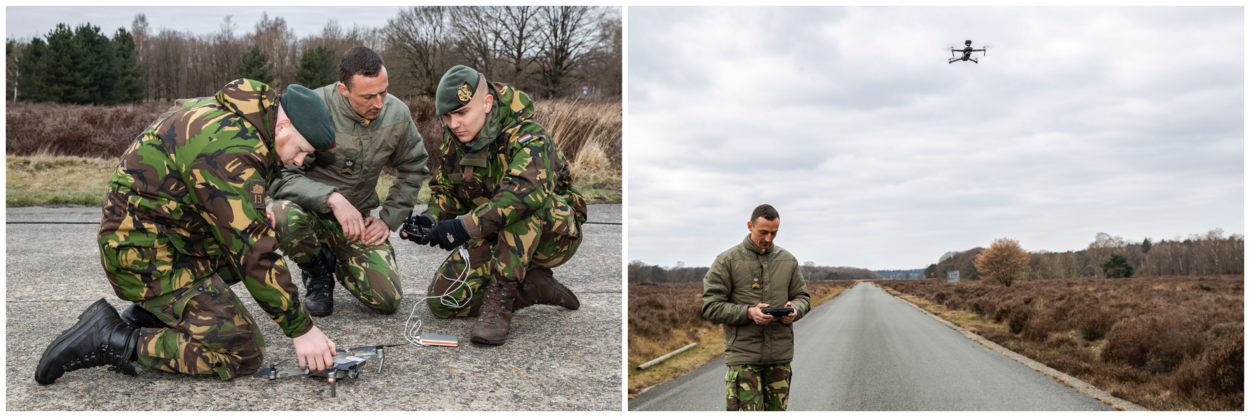“Houd alstublieft 1.5 meter afstand”,, klinkt het uit de lucht. Boven de hoofden van overste Jules en kapitein Tom zoemt een drone met een dusdanig werkende luidspreker dat je 'm niet kunt negeren. De 2 collega's van de eenheid Robotica en Autonome Systemen (RAS) van 13 Lichte Brigade moeten volgens het oefenscenario een groep van wel 10 personen voorstellen. “Maar we houden ons ook tijdens oefeningen aan de RIVM-richtlijnen. Dus zijn we met z’n tweeën”, legt Tom uit.
