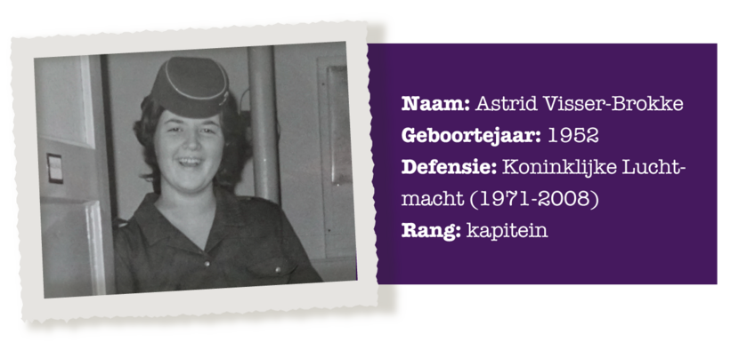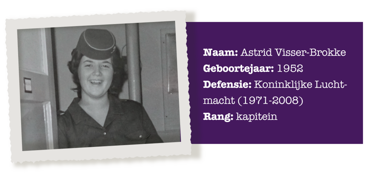 Ze begon als sergeant bij de Luchtmacht Vrouwenafdeling (LuVa) en nam als kapitein afscheid bij de inlichtingendienst. Astrid Visser-Brokke is met recht 1 van de vrouwelijke pioniers binnen de luchtmacht. In de 37 jaar die Astrid diende, was ze meestal de enige vrouw en vaak ook de eerste.