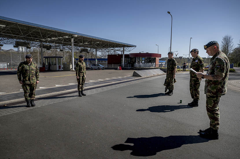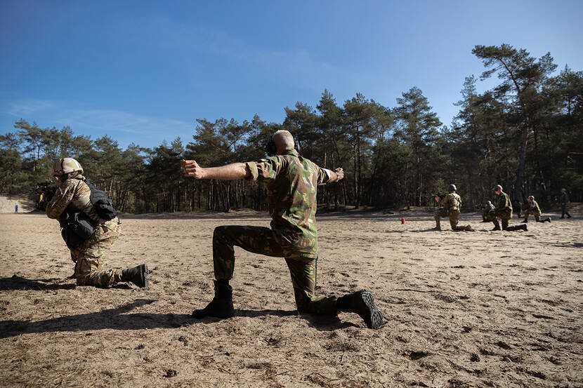Naast het regelmatig ontsmetten van de handen, houdt iedereen tijdens de BULA zo goed mogelijk afstand. Hier legt een instructeur uit hoe het terugtrekken onder vuur in zijn werk gaat. Foto: sergeant Aaron Zwaal