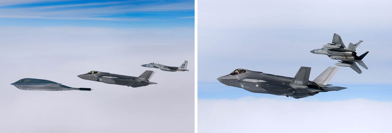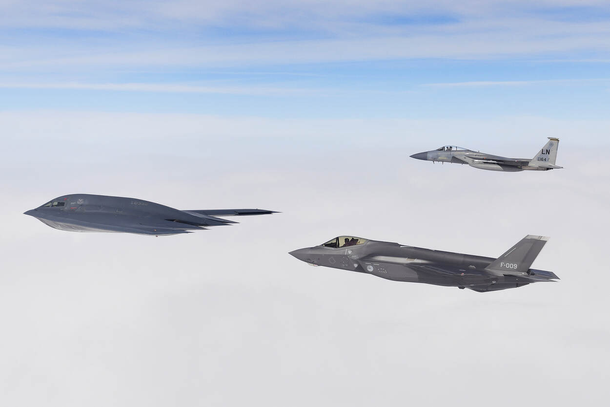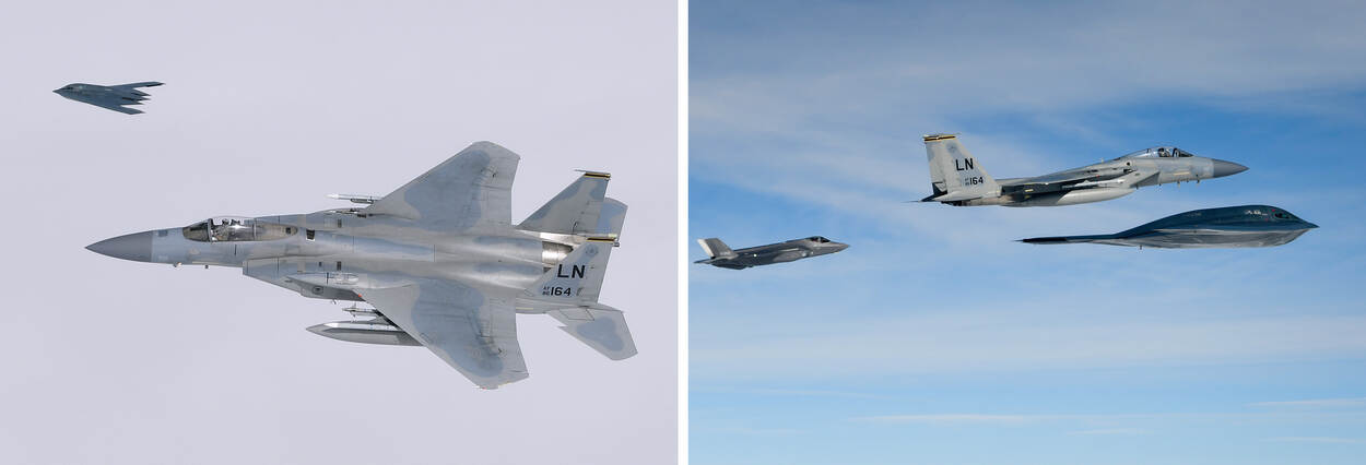 Normaliter staan de B-2’s op de Whiteman Air Force Base in de staat Missouri, maar vorige maand waren de vliegers van 509th Bomb Wing te gast op de Amerikaanse luchtmachtbasis RAF Fairford in Engeland. De F-15’s van de 48th Fighter Wing opereren vanaf hun Britse thuisbasis op RAF Lakenheath.