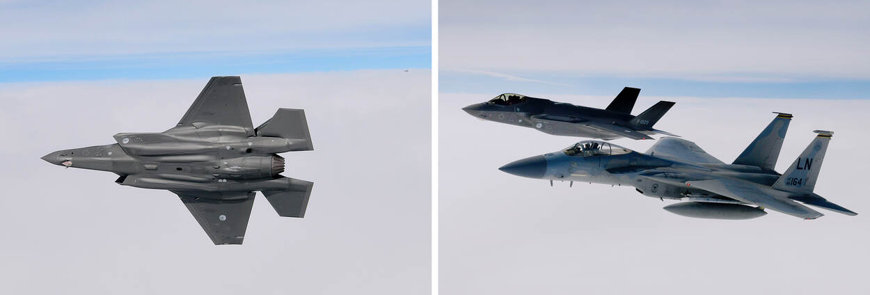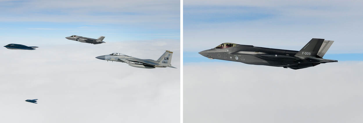 Het is een formatie die je niet vaak ziet. De strategische bommenwerpers B-2 Spirit en een F-15 van de Amerikanen, samen met een F-35 van de vliegbasis Leeuwarden. 18 maart vlogen ze samen boven de Noordzee, ter ondersteuning van de Bomber Task Force Europe 20-2 van de Amerikanen.