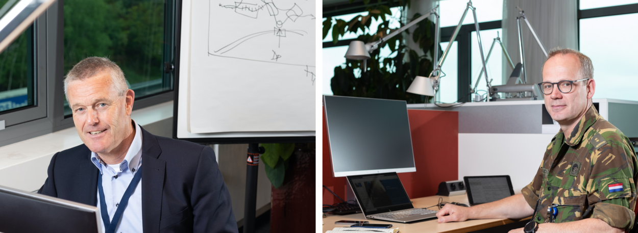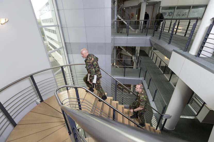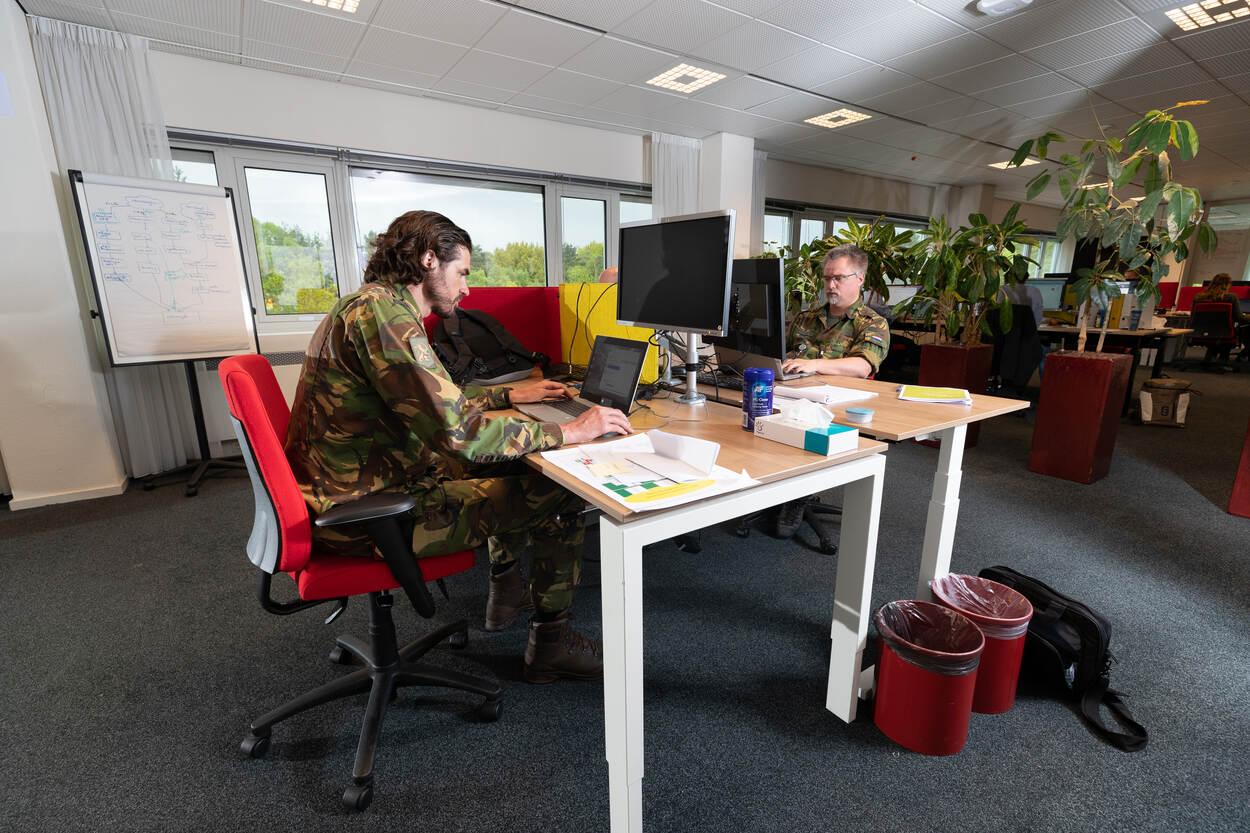 Behalve acties in het heden, kijken bij de sectie Langetermijnplanning van het LOT-C 2 man gericht naar de toekomst. “Langetermijnplanning deed ik de afgelopen jaren op 2 internationale hoofdkwartieren”, zegt luitenant-kolonel Richard Schulte van het Landwarfare Centre. “We kijken naar de zomer van 2021 en 2022. In een snelkookpan proberen we hier in 1 maand een plan op papier te hebben.” “Hoe kunnen we overgaan naar het ‘nieuwe normaal’ en hoe ziet dat er dan uit, bekeken vanuit de veiligheidsketen”, besluit zijn collega generaal-majoor b.d. Hans van der Louw. “De pijnlijke boodschap is dat we hier nog wel even bezig zijn.”