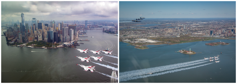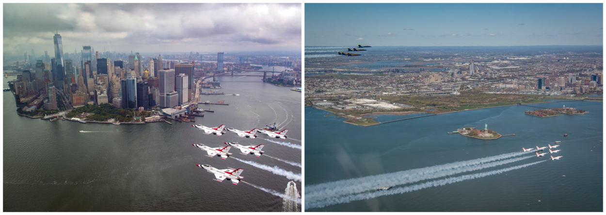 De vliegtuigen van de wereldberoemde militaire demoteams The Thunderbirds en The Blue Angels brachten deze week vanuit de lucht groet aan het zorgpersoneel, vrijwilligers en 'first responders' in New York, New Jersey en Philadelphia.