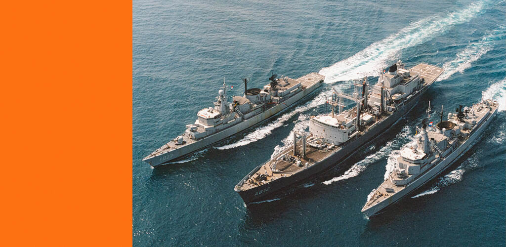 Op de foto het marine-eskader tijdens de Golfoorlog in 1991, met Hr.Ms. Philips van Almonde (F823), Hr.Ms. Zuiderkruis (A832) en Hr.Ms. Jacob van Heemskerck (F812).