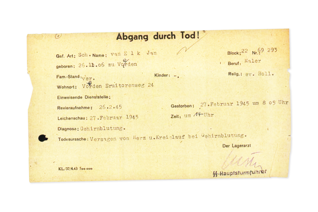 Van Elk overleed op zondag 25 februari 1945 om 8.05 uur ’s morgens. Slechts 39 jaar oud. Officieel door een hersenbloeding; in werkelijkheid door uitputting en ondervoeding. Zijn lichaam werd, met dat van vele anderen, in een massagraf op de Leiterberg gedumpt, zo'n 2 kilometer van het kamp.