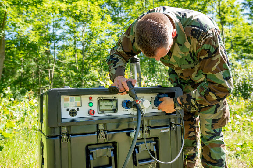 Met een volledig opgeladen energyhub (een superbatterij/powerbank) kan de MCP liefst 4 uur draaien. Zonder hulp van de lawaaiig en diesel slurpend aggregaat. Er moet dan wel zon zijn geweest natuurlijk. “Het scheelt transport van brandstof, wat een risico kan zijn. En we verkleinen de akoestische signatuur; het systeem maakt nauwelijks geluid”, legt kapitein Danny uit.