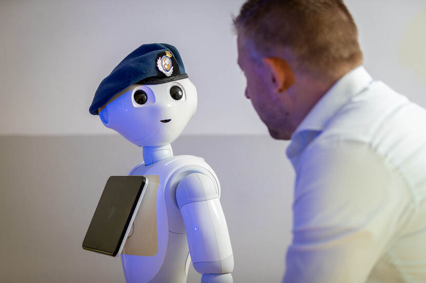 Dit robotje met zijn vragende blik zou weleens de diender van de toekomst kunnen worden. Bij het Innovatielab Bewaken en Beveiligen van de Koninklijke Marechaussee houden ze alle opties open als het om innovatie gaat. Foto: sergeant Sjoerd Hilckmann.