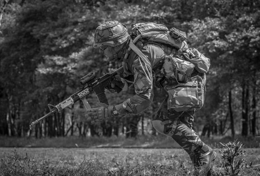 De beweging in dit beeld is zodanig gevangen dat het een opmerkelijke pose oplevert. Een soldaat van de Charlie Compagnie, 20 Natresbataljon springt voorwaarts tijdens een oefening vuur en beweging op Infanterieschietkamp Harskamp. Foto: sergeant-majoor Bert Castricum.