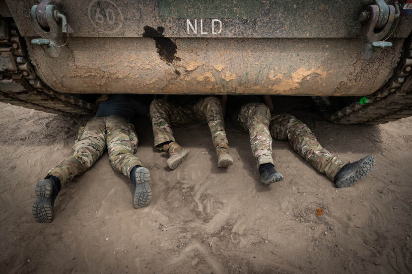 3 paar benen die onder een Panzerhaubitze 2000 uitsteken, verraden dat er flink gesleuteld wordt. De tracks van de 155 mm houwitser speelden op tijdens een schietoefening van de enhanced Forward Presence op het oefenterrein Pabrade in Litouwen. Foto: sergeant Aaron Zwaal.