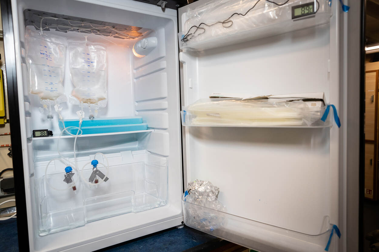 In de halve dag dat woensdag gewerkt kon worden, zijn al veel bodem- en watermonsters genomen. Dat betekent werk voor wetenschappers Arjan den Otter en Martin Olde van TNO aan boord van de Cerberus. "Welkom in ons lab", grapt Den Otter bij 2 koelkasten. "Het zeewater gaat in een infuuszakje en druppelt op een speciaal filtertje ter grootte van een vingerhoedje dat de stofjes tegenhoudt die we later in het laboratorium willen meten. We willen de situatie onder water 'bevriezen'. Bij hogere temperaturen breken de stoffen vanzelf af en kun je ze niet meer meten." Voor de analyse van andere stoffen worden de monsters geconserveerd in een vrieskist om ze later in een laboratorium te analyseren.