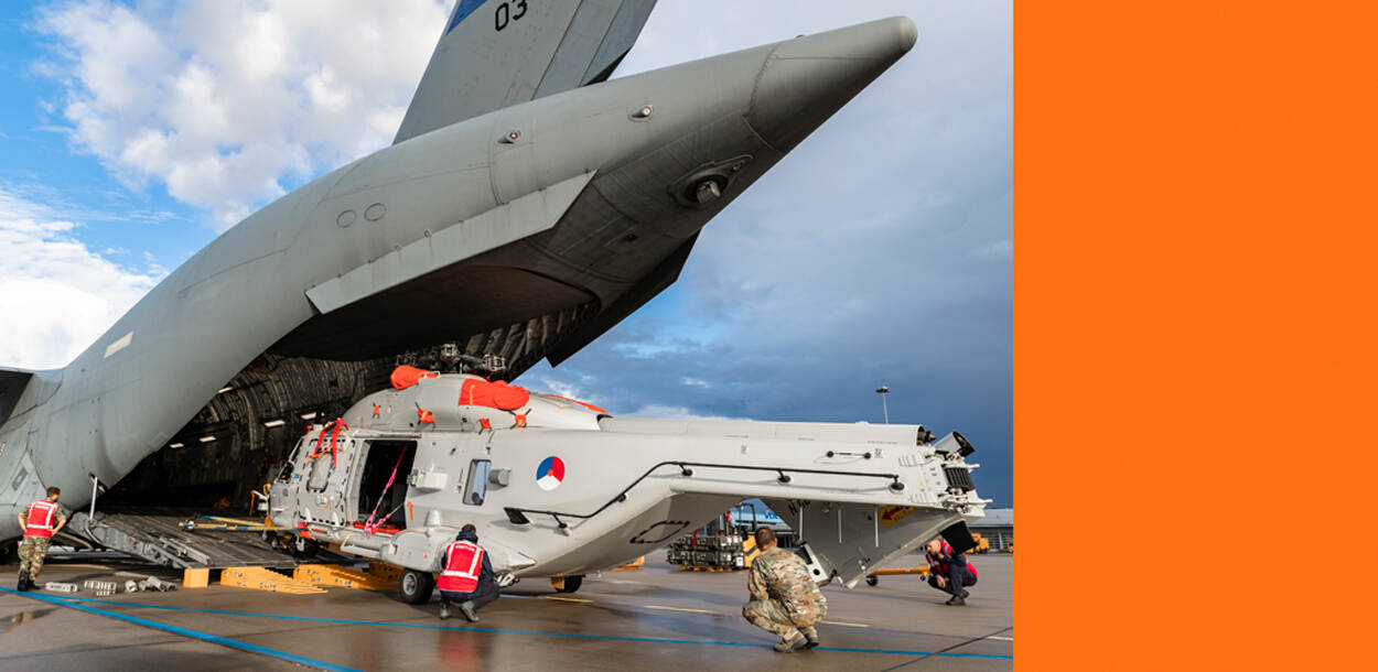 Volgens insiders is de NH90 best een flinke helikopter. Maar ingeladen in een reusachtig C-17 transportvliegtuig lijkt het toch een beetje op het verhaal van de reus en klein duimpje. Dat laat onverlet dat het overvliegen de gevechtshelikopter naar het Caribisch gebied het snelste kon per C-17. Hierdoor kan Zr.Ms. Groningen na 2,5 maand weer beschikken over een boordhelikopter nadat het organieke toestel in juli verongelukte.