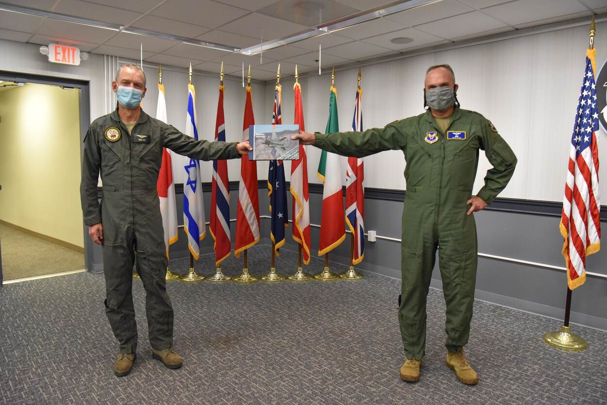 Zo ontmoeten VIP's elkaar in coronatijd: met mondkapje op (ruim) 1,5 meter afstand. Commandant Luchtstrijdkrachten luitenant-generaal Dennis Luyt bezocht onlangs de hoogste baas van het F-35 project in Arlington (VS), ranggenoot Erick Fick. Fotograaf Troy Lilly nam deze toch wel bijzondere foto.