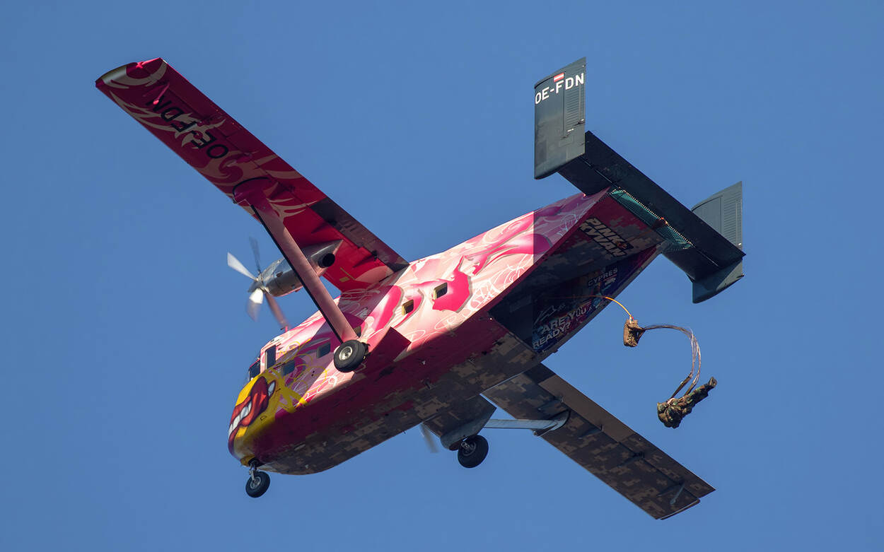 Er zijn maar weinig vliegbewegingen die spotter Bert van der Linden ontgaan. Hij was er ook bij toen recent leden van 11 Luchtmobiele Brigade en het Korps Mariniers boven de Ginkelse Heide de afsprong vanuit een kleurrijke Skyvan maakten. Weer eens wat anders dan een luchtmacht grijze Hercules zullen we maar zeggen.