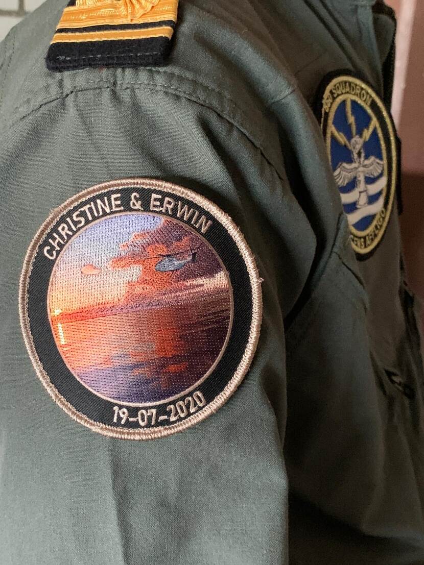 Fotograaf Jarno Kraayvanger schoot een beeld van een vrij uitzonderlijke herdenkingspatch. Collega’s van de dit jaar verongelukte NH-90 vlieger luitenant ter zee Christine Martens en ranggenoot tactical coördinator Erwin Warnies ontwierpen de kunstzinnige afbeelding, waarop een NH90 de zonsondergang tegemoet vliegt. Naast de voornamen van de militairen is ook de datum van het ongeval vermeld.