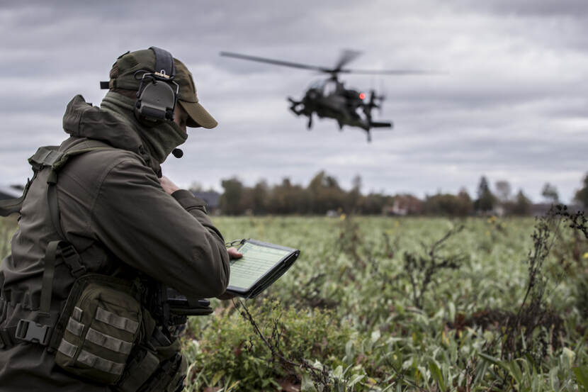 Door Covid-19 is oefenterrein Marnewaard in Noord-Nederland beperkt bruikbaar voor close air support oefeningen. En daarom werd oefening Purple Windmill dit jaar op een defensielocatie bij het dorp Vredepeel in Limburg gehouden. Fotograaf sergeant-majoor Maartje Roos brengt met deze foto de samenwerking tussen eenheden in de lucht en op de grond in beeld. Naast Nederland deden ook België, Denemarken en Frankrijk mee aan Purple Windmill.