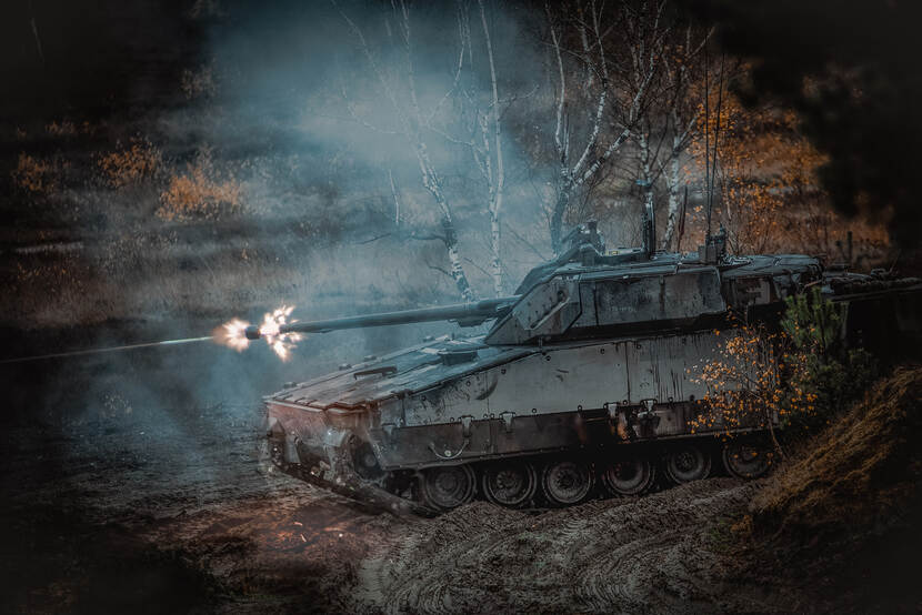 Wederom een creatief en prettig-om-naar-te-kijken beeld van soldaat-1 Wessel Zuijderduin. Hij schoot de vurende CV90 tijdens de onlangs gehouden SOB/SOMS (Schieten op Bergen/Schieten op Munster-Süd) op het Duitse oefenterrein Bergen-Hohne. Hier certificeerde 44 Pantserinfanteriebataljon Johan Willem Friso zich op pelotonsniveau voor de uitzending naar Litouwen volgend jaar.
