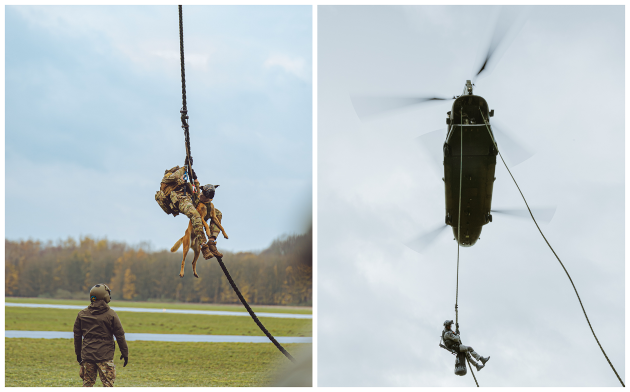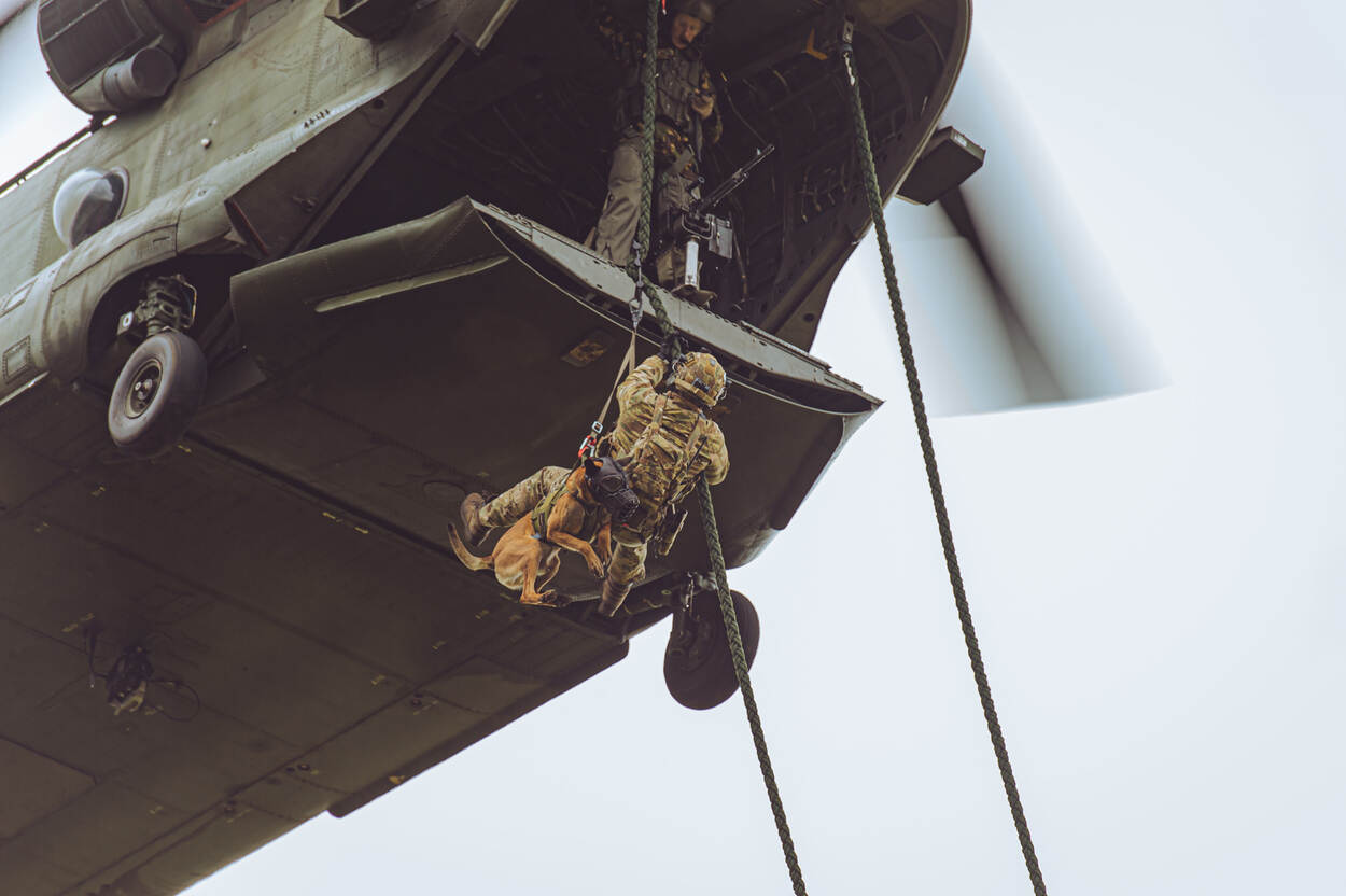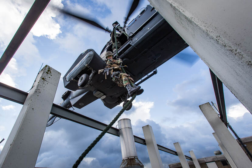 Uit een stil hangende helikopter klimmen en via een vuistdik touw naar beneden glijden. Maximaal dertig meter met enkel je handen en voeten om veilig je weg naar de grond te vinden. De zwaartekracht zijn werk laten doen: het ziet er makkelijk uit, maar dat is het allerminst.