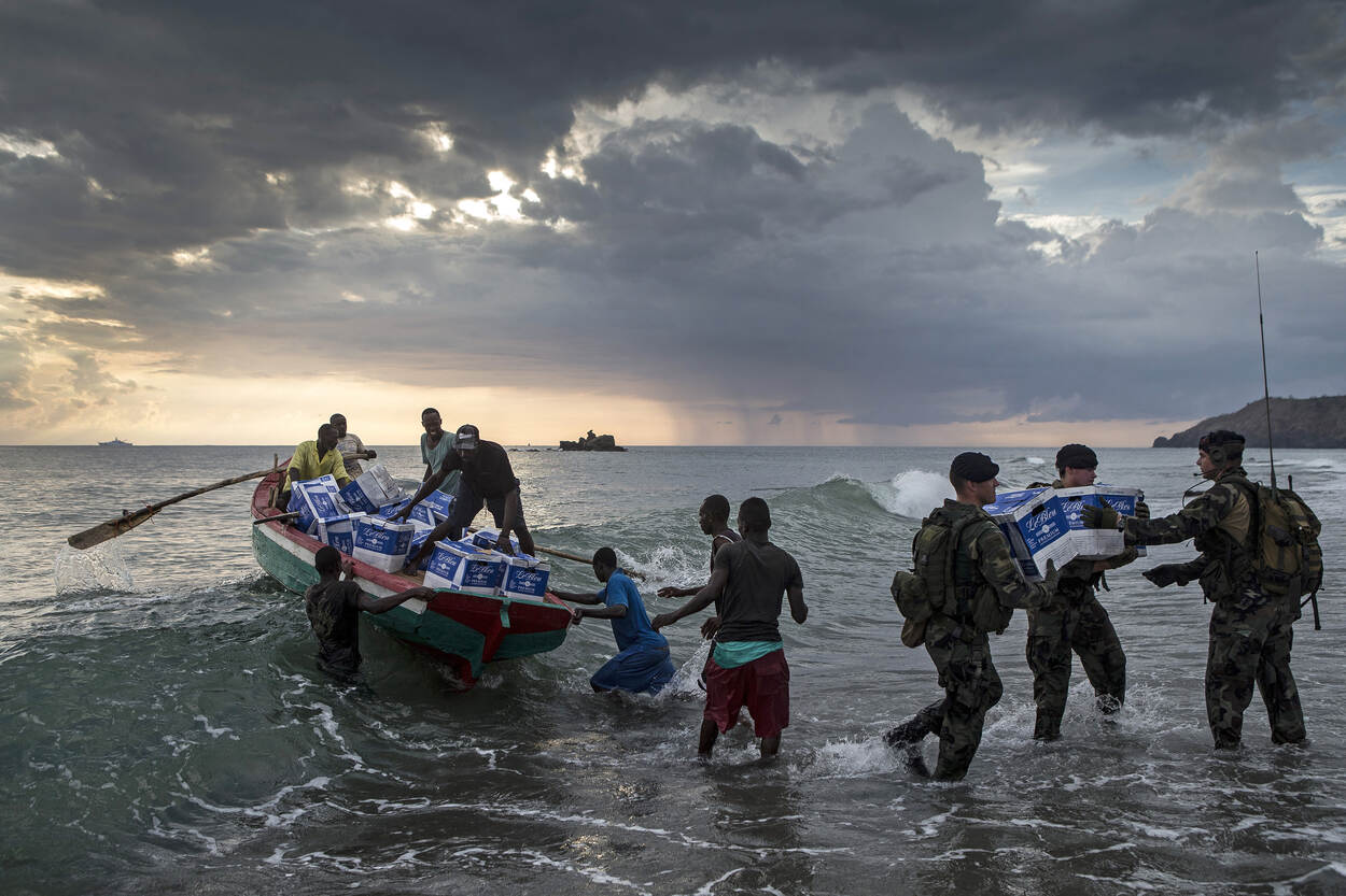 Van tevoren wist ik dat dit een mooie foto zou worden. Die golf rolt mijn kant op, in de verte nadert een onweersbui. Je ziet Zr. Ms. Holland liggen én de samenwerking tussen onze mariniers en de lokale bevolking komt naar voren. Alles klopt gewoon. Het was alleen nog even spannend of ik het qua timing zou redden. Een paar seconden later en die golf had mij én mijn camera omver gespoeld. Maar alle stukjes van de puzzel vielen gelukkig precies in elkaar.