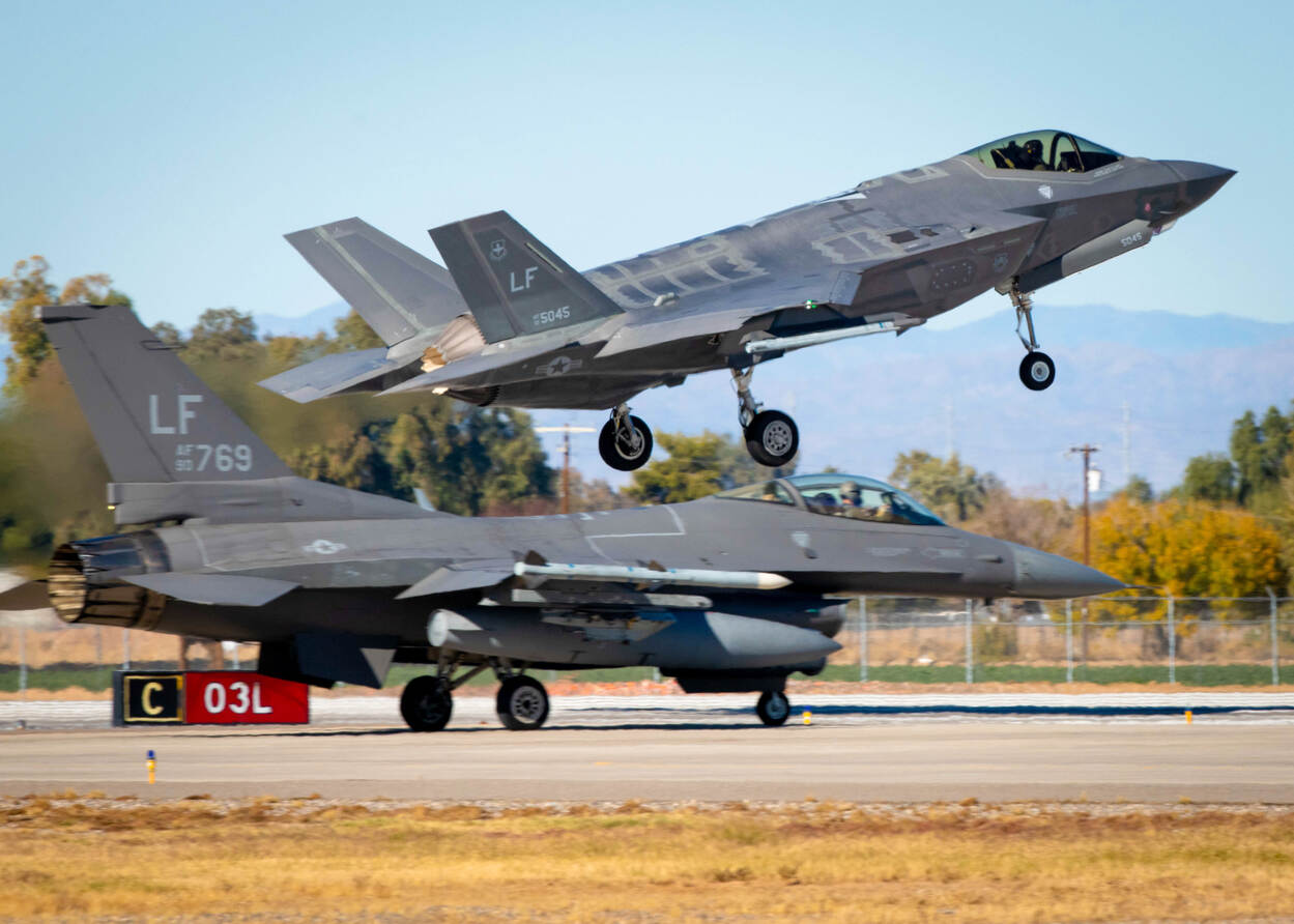 Op Luke Air Force Base in Tucson (Arizona) laat fotograaf Airman 1st Class Brooke Moeder het net lijken of deze F-35 Lightning II bovenop een gereedstaande F-16 Fighting Falcon landt. Geen nood! Alles gaat goed. 'Luke' is de basis waar Nederlandse vliegers worden opgeleid op de o zo moderne Lightning II. Het is maar dat u het weet.