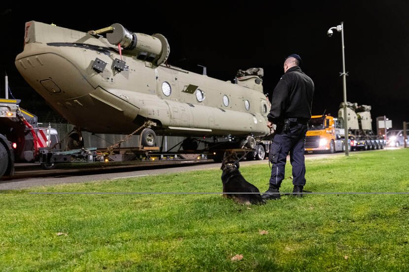 Het was voor fotograaf sergeant Aaron Zwaal op 13 januari een latertje. Om precies 23.26 uur knipte hij op vliegbasis Woensdrecht de aankomst van een nieuwe Chinook. Eerder was de nog deels gedemonteerde transportheli vanuit de VS in de haven van Antwerpen aangekomen. Na ‘afmontage’ bij het Logistiek Centrum Woensdrecht gaat dit toestel vliegend naar zijn thuisbasis Gilze-Rijen. Bij de poort houdt een functionaris van de Defensie Bewakings en Beveiligings Organisatie (DBBO) een oogje in het zeil.