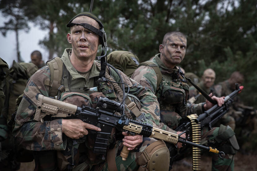 Corona of niet, de opleidingsmachine van het Korps Mariniers blijft doordraaien. Afgelopen maandag klikte fotograaf sergeant Aaron Zwaal deze stoere foto van de eerste lichting afgepeigerde aspirant-zeesoldaten van het jaar. Op de oefenlocatie Beekhuizerzand nabij Harderwijk hadden de mannen er net een speedmars van 2,5 kilometer met bepakking op zitten, toen ze op de gevoelige plaat werden vastgelegd. De eindoefening loopt nog tot vandaag. Aansluitend vindt op de Van Ghentkazerne in Rotterdam de baretuitreiking plaats. Vanwege de corona-restricties uiteraard zonder genodigden.