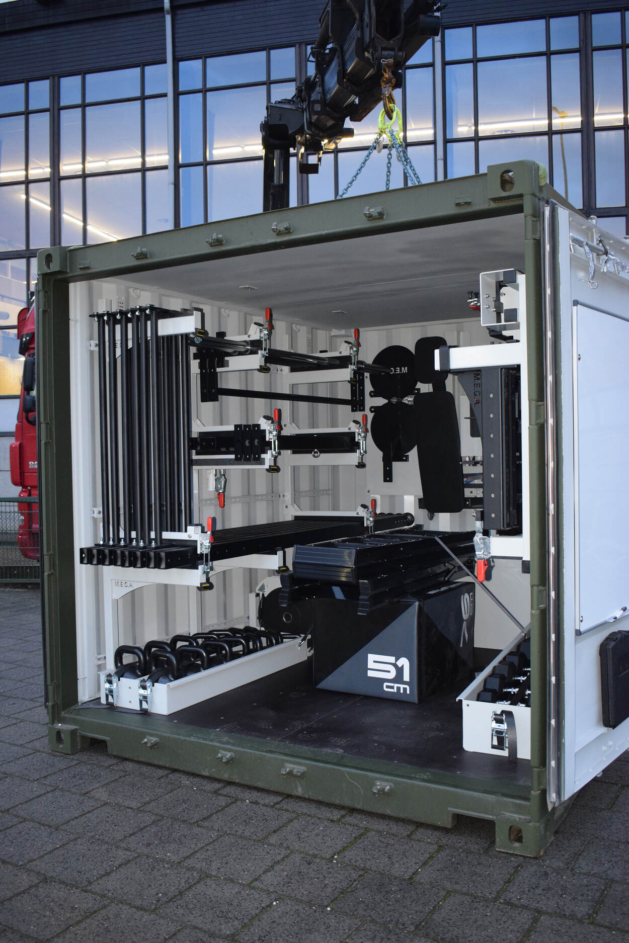Het gaat om donkergroene zeecontainers vol materialen voor High Intensity Interval Training en Crossfit work-out. Verschillende stellages kunnen aan de buitenkant van de container bevestigd worden, waardoor ‘ie niet alleen dient als sportopslag maar ook decor wordt van de trainingen. “Het is een kant-en-klaar systeem (deployment box). Neerzetten, openen, opbouwen en je kunt aan de bak. Er is een standaard uitrusting, maar iedereen kan deze naar voorkeur uitbreiden. Bijvoorbeeld met bosu-ballen en TRX-koorden”, reageert Burgers enthousiast.