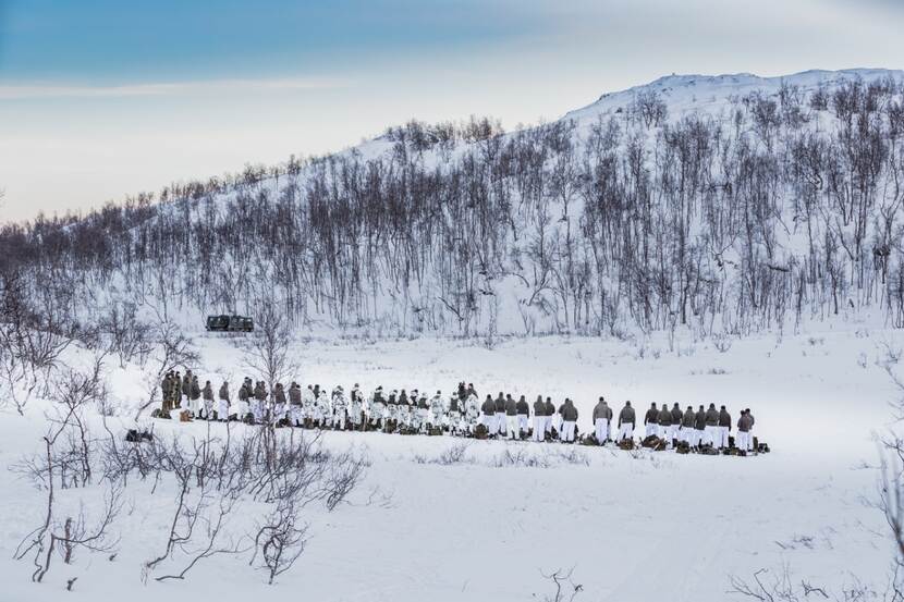 Leden van het Duitse Seebataillon volgen momenteel in Noorwegen de Joint Arctic Training, onder leiding van het Nederlandse Korps Mariniers. Met temperaturen ver onder nul leren zij op het oefenterrein Mauken optreden en overleven onder extreme omstandigheden. Op de foto staan zowel Duitse als Nederlandse militairen, tijdens een les camouflage in de openlucht. Fotograaf sergeant Cristian Schrik tekent voor deze mooie plaat.