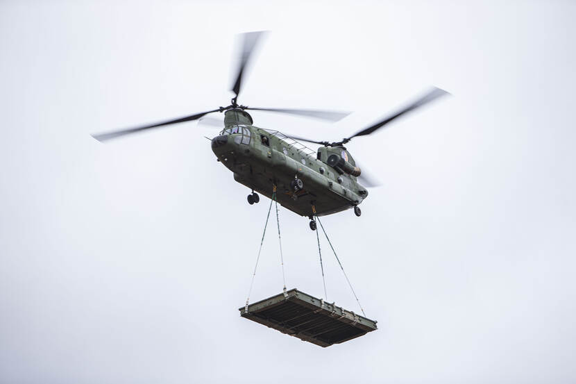 Het gaat dus vooral om samenwerking. Zo ook met het Obstacle & Mine-peloton van 11 Luchtmobiel. De genisten bouwden een Medium Girder Bridge: een brug die je bijvoorbeeld over een rivier kan leggen en waarmee je mensen en middelen veilig naar de overkant kunt krijgen. Zo’n gevaarte van 9 meter en ruim 5.000 kilo door de lucht vervoeren levert een indrukwekkende plaat op.