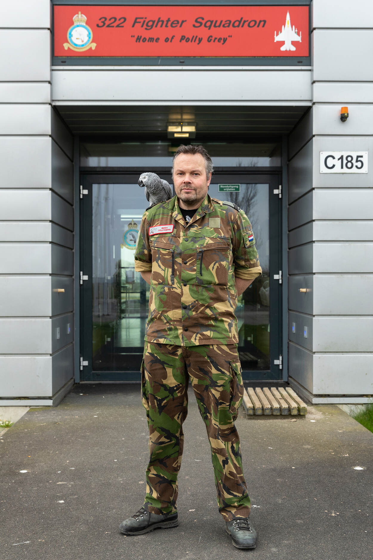 ‘Niet praten, maar doen’. De wapenspreuk van 322 krijgt wel een hele bijzondere betekenis als je weet dat de mascotte een papegaai is. “En wist je dat deze papegaaien de beste praters zijn, maar de slechtste vliegers”, doet Polly’s vaste verzorger sergeant-1 Berry Stolk er nog een schepje bovenop.