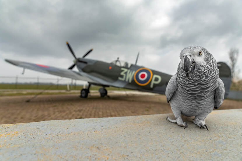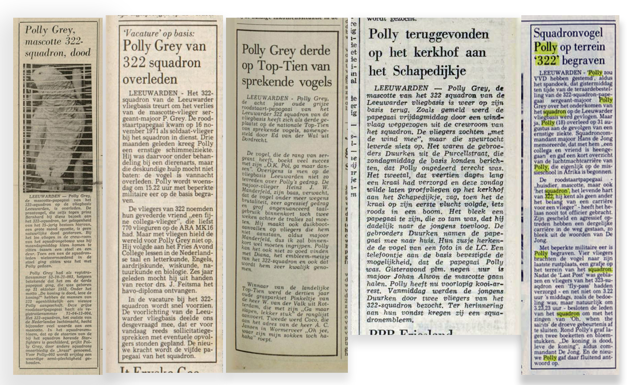 Ze werd meegenomen uit de London Zoo, vloog mee met een Starfighter, kreeg de rang van sergeant-majoor en de nu vijfde Polly Grey legde onlangs zelfs eieren. Sinds jaar en dag is deze grijze roodstaartpapegaai van 322 Squadron dé enige levende luchtmachtmascotte van Defensie.