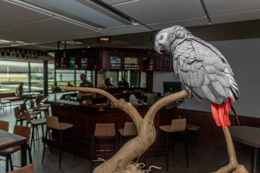 Leuk aan een papagaai is natuurlijk dat je hem of haar van alles kunt leren. En dat is bij een defensie-eenheid vol militairen niet tegen dovemansoren gezegd. “Haar vocabulaire is groot. Haar schunnige woordenboek ook”, vat Stolk samen. “Ook weet ik nog goed dat we haar het Feyenoordlied hebben geleerd, net voordat ze ging logeren bij een collega die ontzettend Ajaxfan is. Hij kon er niet om lachen. Het beestje had ‘t weekend niets anders gedaan dan gezongen.”