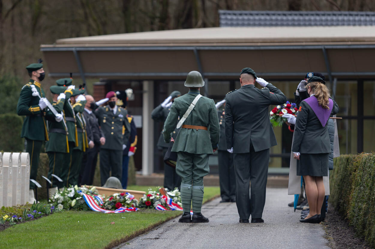Sergeant Aaron Zwaal was erbij toen op Ereveld Grebbeberg in Rhenen drie militairen van de landmacht werden herbegraven. Op de plaat wordt de laatste eer bewezen aan soldaat Johannes Bronswijk. De 19-jarige tuinder uit Naaldwijk sneuvelde in de vroege ochtend van 10 mei 1940 tijdens felle gevechten met Duitse luchtlandingseenheden op vliegveld Waalhaven.