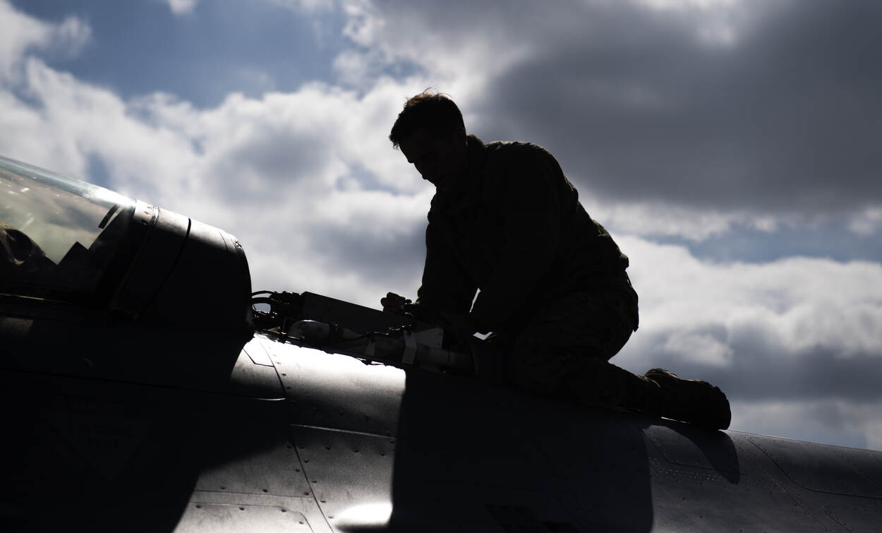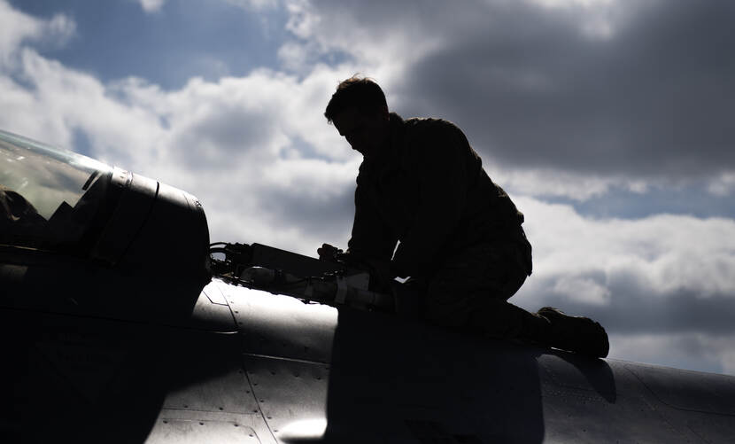 Een F-16 van de Amerikaanse luchtmacht wordt klaargemaakt voor een oefenvlucht met een Nederlands jachtvliegtuig tijdens oefening Point Blank 21-02 vorige week. Senior Airman Ali Stewart maakte weliswaar een kleurenfoto, maar omdat hij tegen het licht in fotografeerde lijkt het een zwart-wit foto. We zien alleen de contouren van vliegtuigtechnicus sergeant Kenneth Birkemeier.